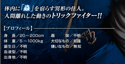 ドライブボタンの能力は相手に「烙印」と呼ばれるエフェクトを付加させ、烙印が付いている間は通常技・必殺技問わず画面内外から様々な「蟲」が出現し攻撃を仕掛ける。
